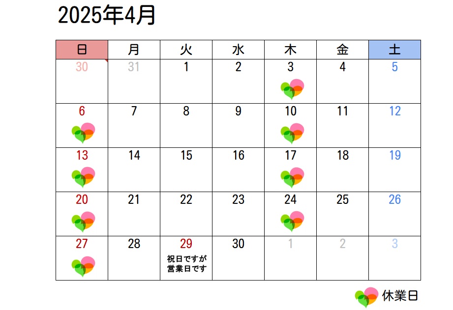 2025年4月29日(火)のみ祝日ですが、9:30~19:00は開局しております。
