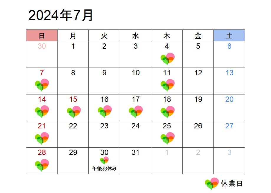 2024年7月30日(火)午後は臨時休業することとなりました。